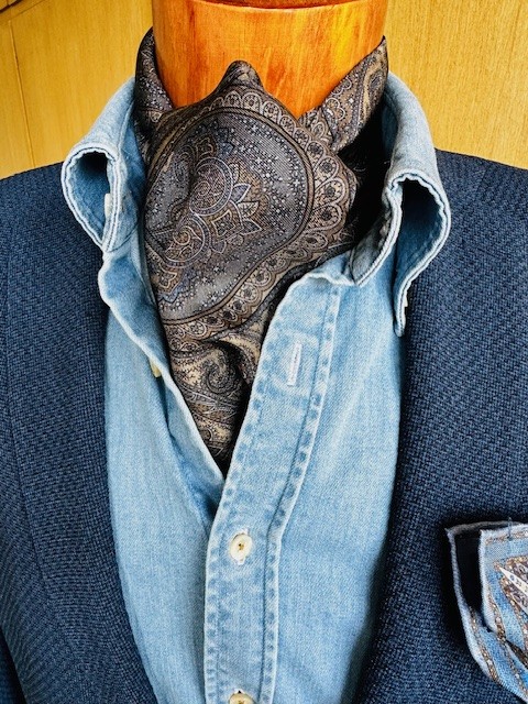 100% Seide bedruckt Gumtwill finishing ca. 16 x 138cm gearbeitet als Schlauchschal, spitz zulaufend handgenäht in Deutschland Ascot Webetikett